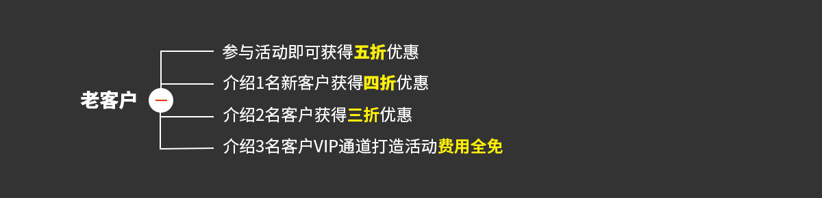 老客戶限定優(yōu)惠: (VIP參觀通道打造售價:6.8萬元)報名即可享受5折優(yōu)惠! 介紹客戶 惠上加惠! 介紹新客戶 介紹一名新客戶獲得四折優(yōu)惠 介紹兩名客戶獲得三折優(yōu)惠 介紹三名客戶VIP通道打造活動費用全免 一圖詳解老客戶優(yōu)惠: