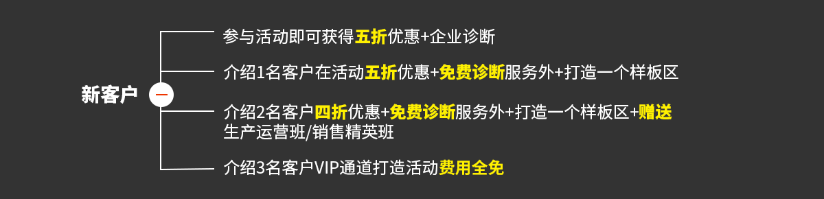新客戶限定優(yōu)惠:企業(yè)年產(chǎn)值3000萬以上即可報名 (VIP參觀通道打造售價:6.8萬元)參與活動即可獲得5折優(yōu)惠!+企業(yè)診斷 介紹客戶 惠上加惠! 介紹新客戶 介紹一名客戶在活動五折優(yōu)惠+免費診斷服務(wù)外+打造一個樣板區(qū) 介紹兩名客戶四折優(yōu)惠+免費診斷服務(wù)外+打造一個樣板區(qū)+贈送生產(chǎn)運營班/銷售精英班 介紹三名客戶VIP通道打造活動費用全免 一圖詳解新客戶優(yōu)惠:
