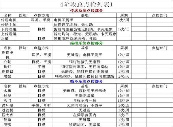 設(shè)備六大系統(tǒng)總點檢、標(biāo)準(zhǔn)優(yōu)化對設(shè)備六大系統(tǒng)(傳動系統(tǒng)、液壓系統(tǒng)、潤滑系統(tǒng)、電氣系統(tǒng)、氣動系統(tǒng)、螺絲螺母緊固系統(tǒng))總點檢;根據(jù)設(shè)備整體結(jié)構(gòu)圖擬定設(shè)備點檢系統(tǒng)圖,采用立體效果圖的方式明確展示點檢部位、順序;制作圖文并茂的操作流程并在崗合適位置展示,培訓(xùn)和監(jiān)督操作員按正確的操作進行作業(yè);結(jié)合設(shè)備六大系統(tǒng)總點檢,進行優(yōu)化簡化編制成總點檢手冊。