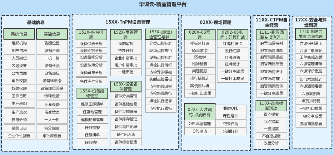 現(xiàn)場6S管理,全員持續(xù)改善,精益生產(chǎn),CTPM自主保全,TnPM設備管理,班組建設,員工績效與技能提升,一站式采購