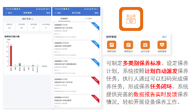 制定自主保全標準和計劃、自動派單,掃碼執(zhí)行,并提供保養(yǎng)看板自動更新任務進度