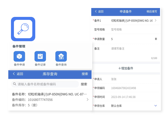 支持與備件模塊聯(lián)動,記錄檢維修過程消耗備件情況,可自動更新備件庫存。
