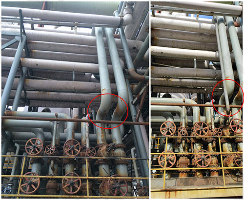在污氮?dú)夥謿獍隹诠苌嫌脧U舊管道連接新老系統(tǒng)洗塔管,通過此管道其余10臺塔也能用污氮?dú)庀此?/p>