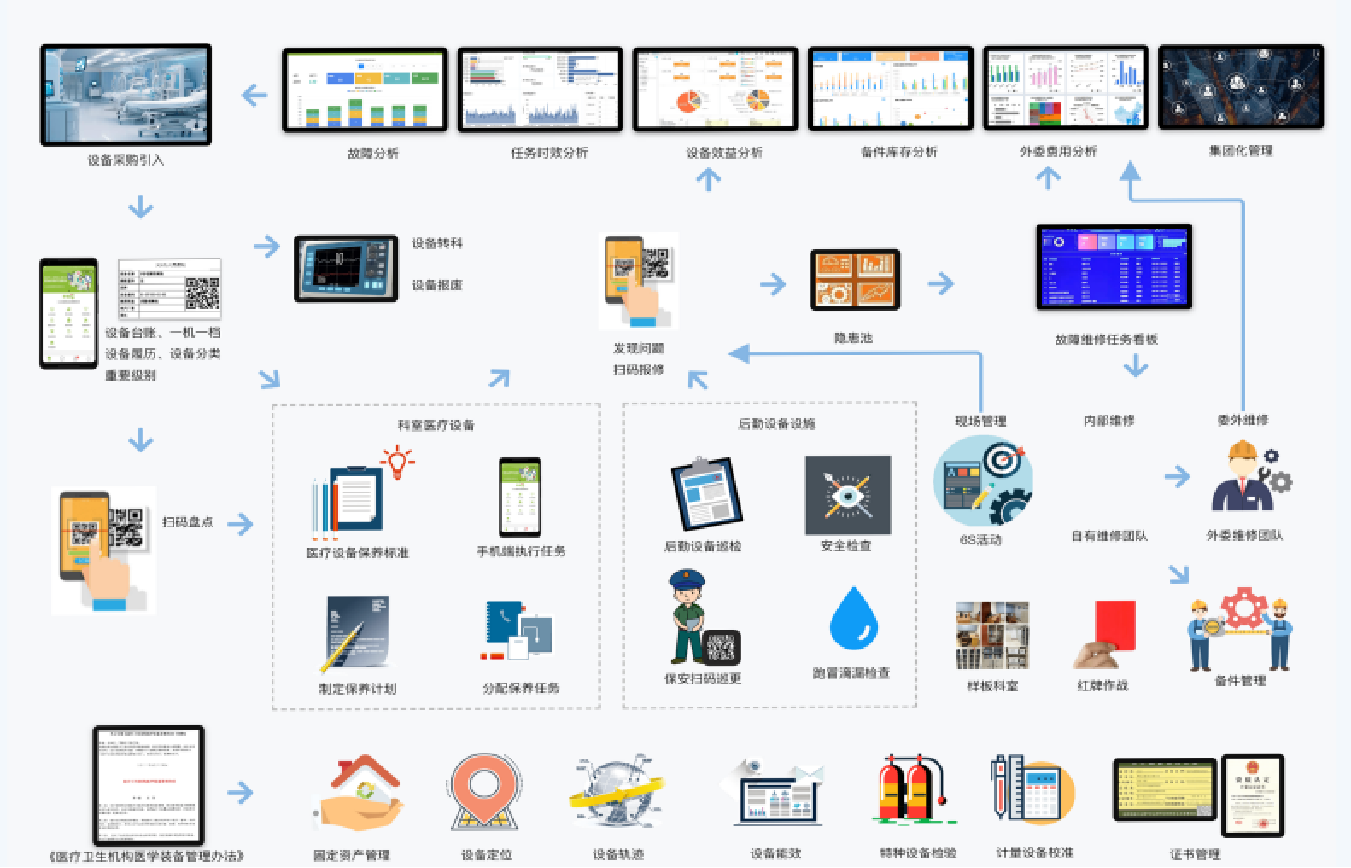 華醫(yī)修制原創(chuàng)的設(shè)備三圈防護(hù)維保體系解決方案,包含八大子系統(tǒng),通過咨詢+信息化的落地方式,全面提升醫(yī)院的精益管理水平