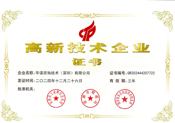 根據(jù)國家《高新技術企業(yè)認定管理辦法》和《高新技術企業(yè)認定管理工作指引》的有關規(guī)定,華謀咨詢技術(深圳)有限公司憑借團隊專業(yè)技術研發(fā)能力、持續(xù)創(chuàng)新能力和企業(yè)管理能力,順利通過由科技部、財政部、稅務總局組織的國家高新技術企業(yè)認定,目前,華謀咨詢技術(深圳)有限公司是國內(nèi)管理咨詢領域內(nèi)獲得國家高新技術企業(yè)認證的企業(yè)。