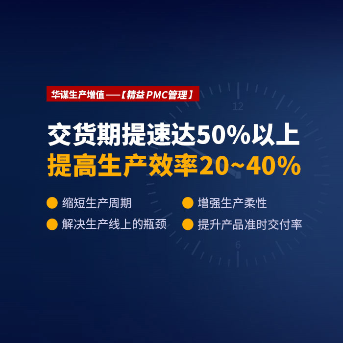 PMC柔性提升建立銷售、計劃、采購、倉管與生產(chǎn)的配合體系,以及年度、月度、周、日、時的生產(chǎn)計劃分解體系,使計劃更加系統(tǒng),客戶的變化能夠快速跟進。